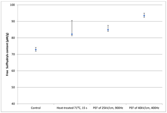 In this study, PEF processing using a high electric field intensity of 40 kV/cm and a 400 Hz frequency induced the partial unfolding of proteins and exposed the free SH to the surface to form disulphide bridges, denoting protein aggregation (Figure 10). In addition, processing SPI dispersion with 25 kV/cm and 900 Hz also caused protein unfolding (84.9 μM/g SPI ± 2.7) compared to the control SPI sample (72.83 μM/g SPI ± 1.3).