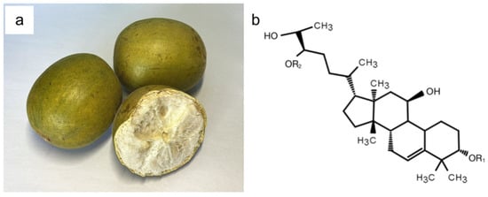 The fruit of Momordica grosvenorii (a) and the chemical structure of MGS (b).