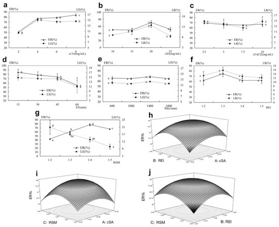 Factors affecting MGS capsule preparation. Effect of (a) cCTS; (b) cSA; (c) cCaCl2; (d) ST; (e) SS; (f) REI; (g) RSM on the encapsulation rate (ER) and loading efficiency (LE); three-dimensional surface plots showing the effect of varying components (h) cSA; (i) REI; (j) RSM on ER; a,b,c,d, ab, and bc in the line chart means the difference of significance among the groups.