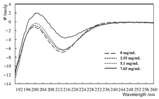 To show the potential of sodium alginate in wrapping MGS, a CD analysis was performed. As shown in Figure 3, the signal of CD increased with the concentration of MGS, and the peak had a sight wavelength shift. This kind of shift would be concluded as the changes of unit G in SA, resulting in a better encapsulation effect [].