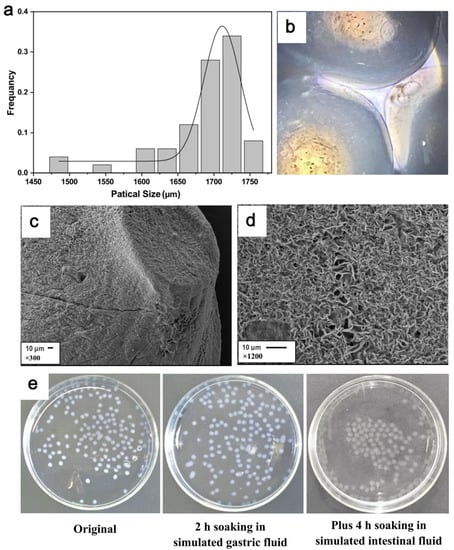 Characteristics of MGS capsule appearances. (a) particle size distribution; (b) micro-graph; (c) SEM morphology under 300 magnifications; (d) SEM morphology under 1200 magnification; (e)macroscopic characteristics of MGS capsule’s changes after stimulated gastrointestinal environments.