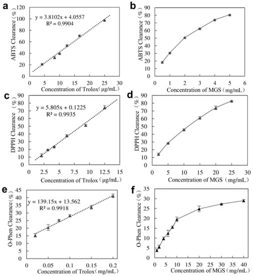 The antioxidant activity of MGS capsules is presented in Figure 5. When 5 mg/mL MGS-containing capsules were selected, the ABTS radical scavenging reached 80.72%. Their IC50 was 1.82 mg/mL and corresponded to the Trolox yield of 26.50 μmol/g (Figure 5a,b). The MGS capsules had a DPPH radical scavenging of up to 82.89% when the concentration of MGS was 25 mg/mL. Their IC50 was 9.61 mg/mL and corresponded to a Trolox yield of 3.58 μmol/g (Figure 5c,d). O-Phen test showed that 10 mg/mL MGS-containing capsules had a maximal antioxidant capacity of 19.54% (Figure 5e,f). In our case, the encapsulated MGS showed good antioxidant activity, depending on its concentration.