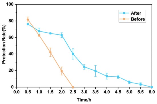 ABTS free radical scavenging ability was used as an antioxidant activity index with reference to Miller’s method []. Briefly, after soaking the MGS capsules in simulated gastric fluid for 2 h, the mixture was collected at different time intervals, followed by centrifugation at 8000 r/min for 5 min to collect the supernatant (0.1 mol/mL NaOH, and pH was adjusted to 7). Then, the antioxidant activity in the supernatant was determined by calculating the absorbance value after mixing with ABTS, as did Equation (3) in 2.6.