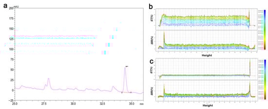 The potential of MGS capsules in drinking with soft and sweet tastes is presented in Figure 8. It was seen that this beverage contained 19 mg/mL MGS determined by the HPLC method (Figure 8a). Its content of total titratable acid was 0.28 mg/mL with a pH of 3.91. The total sugar content was 19.22 mg/mL, and the soluble solids were 5.0%. This drinking had high stability, as observed in Figure 8b,c, demonstrating the stability of the capsules. Compared with the standard sample, the light scattering dropped clearly, which indicated that the MGS embedded in the sodium alginate and chitosan kept a good dispersibility. Our current results proved that the specific beverage containing MGS capsules is worthy of promotion for health direction regarding the ability of the wrapped compound to resist adverse environments and the potential functionality.
