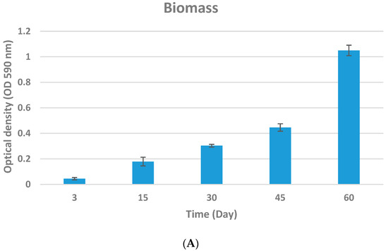 The ability of S. boulardii to form biofilm on the glass surface was evaluated over the 60 days of bottle ageing. Three main biofilm parameters, including biomass, metabolic activity, and extracellular matrix, were measured by crystal violet, XTT, and safranin procedures, respectively. The statistical analysis between time points revealed significant differences in the amount of biomass, biological activity, and extracellular matrix, indicating biofilm formation on the glass surface (Figure 3). Biomass and extracellular matrix increased in a time-dependent manner and reached their highest amount after 60 days of storage (p < 0.05). However, a low metabolic activity was recorded despite the presence of a thick biofilm (high biomass and extracellular matrix) at day 60 (p > 0.05).