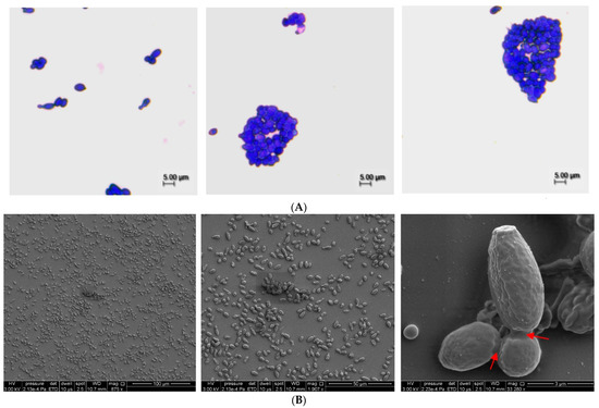 Light microscopic and SEM observations of S. boulardii CNCM I-745 biofilms formed on the glass surface in the beer model after 72 h of storage at 20 °C. (A) Light microscopic micrographs (magnification: ×400, scale bar 5 μm) depicting attached single cells and developed microcolonies on the glass surface. (B) SEM micrographs displaying the biofilm structure and amorphous extracellular matrix between cells (arrows).