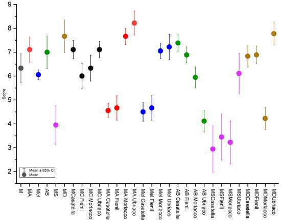 An opposite trend was shown by the AB cider which score decreased with the increase in the cheese’s aging period. Finally, in the case of MD cider, the high score reported when consumed alone is reproduced only by its combination with Ubriaco while the score decreased in the other cases, particularly in the case of the pairing with Morlacco.