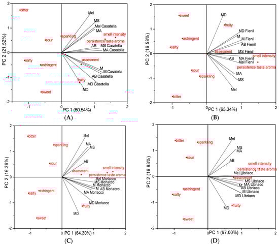 In order to verify the similarities regarding sensory characteristics, the PCAs of the ciders alone and paired with the different cheeses are reported in the four panels of Figure 3. When the ciders were paired with Casatella (Figure 3A), the two dimensions explain 82.06% of the total variance. The PC1 axis distinguishes, in the positive part, all the ciders alone and in combination with the Casatella. The PC2 axis divides the Mel, MS, MA ciders alone and in combination; moreover, it also includes AB. The negative part of PC2, on the other hand, includes the AB paired with Casatella, along with MD, M ciders alone and in combination with Casatella. The positive part of PC2 shows the ciders and combinations characterized by smell intensity, persistence taste aroma and sparkling, while in the negative part of PC2 the ciders and the combination with Casatella are characterized by a fruity perception and a better judgment of acceptability.