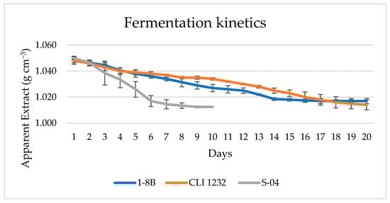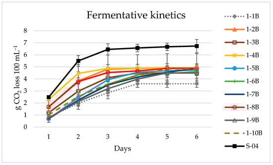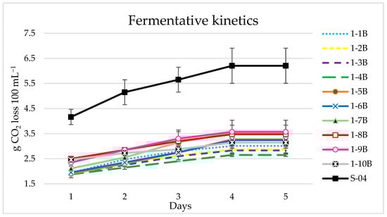 The 10 strains of L. thermotolerans were used to first ferment 100 mL samples to determine their behaviour in the beer wort. They showed a lower ability to ferment the wort (2.65 to 3.48 g CO2 lost) compared to the S-04 S. cerevisiae control strain (6.21 g CO2 lost), with the strains 1-7B, 1-8B and 1-9B being the best of all (3.5 g CO2 lost) (Figure 1). Nevertheless, fermentation stabilised after five days, as with the control strain. The L. thermotolerans species has been described as maltose-fermenting but not maltotriose-fermenting [,], which was contradicted in the Durham test, where all yeasts were positive for maltose fermentation. Residual maltose can cause undesirable aromas or flavours in the final beer []; however, no unpleasant aromas were perceived in the 1 L and 100 L beers tasted. Likewise, the sweetness contributed by maltotriose to the beer is significantly less than that which can be contributed by residual glucose or sucrose [].