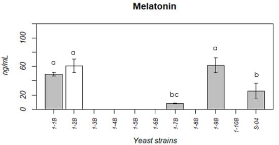 Figure 2 shows the concentration of melatonin produced by the different strains of L. thermotolerans. As with the other non-Saccharomyces yeast strains isolated from Madrid agriculture (IMIDRA Autochthonous Yeast Collection) [], the concentrations obtained by the L. thermotolerans strains were higher than those obtained by the Saccharomyces strains []. However, the melatonin-producing non-Saccharomyces strains were lower.