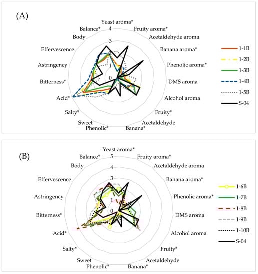 This sensory analysis allowed us to obtain a formal and structured descriptive profile of the taste of the beers, assessing the intensity of each attribute. Overall quality scores were also used to rate the complete quality of beers (EBC method 13.10) []. The attributes to be identified were classified into three groups: appearance (colour, foam retention), smell (esters, alcohols) and taste (alcohol, sweet, salty, acidic, bitterness, astringency, effervescence, warmth, slickness, body). Each attribute was rated on a scale of 0 to 5 points according to its presence or absence. The main average values of the different attributes of each beer were plotted on a radar graph.