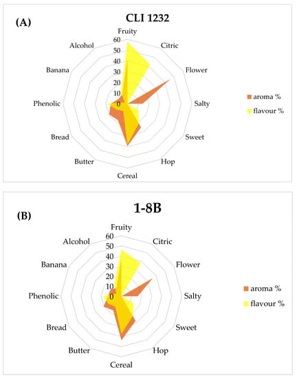 Higher alcohols are the most abundant compounds found in the beer. In this study, strain 1-10B stood out for its higher production (158.13 mg L−1) compared to the control strain S-04 (139.08 mg L−1). Likewise, strains 1-7B (128.94 mg L−1) and 1-9B (122.69 mg L−1) were also close to these values. The main differences observed between strains were in isoamyl alcohol production, whose threshold is 70 mg L−1 [] and was exceeded in strains 1-7B and 1-10B (84.32 and 79.21 mg L−1, respectively). Although strains 1-8B and 1-9B did not exceed this threshold (64.13 and 67.72 mg L−1), concentrations higher than those of strain S-04 (60.67 mg L−1) were obtained, but with no significant differences. Isoamyl alcohol imparts alcohol, banana and sweet flavours to beer, being one of the most abundant higher alcohols found in beer along with isobutanol and β-phenyl ethanol. For isobutanol (solvent aroma), all strains except 1-6B produced higher concentrations (ranging from 12.46 to 24.43 mg L−1) than the control strain S-04 (12.25 mg L−1), although in no case was the threshold exceeded (100 mg L−1) []. Similar values in isobutanol (16.56 to 16.67 mg L−1) and isoamyl alcohol (from 52.99 to 54.87 mg L−1) were obtained by Holt et al. in their studies with L. thermotolerans []. Likewise, Callejo et al. showed higher isobutanol levels with L. thermotolerans (7.6 mg L−1 in 5 °P wort and 36.3 mg L−1 in 15 °P wort) in their studies [].