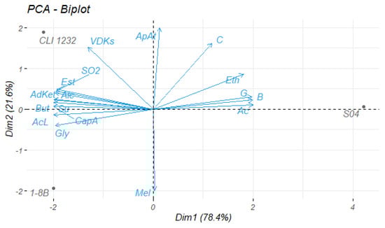 In terms of fatty acid production, strains 1-2B, 1-3B, 1-5B, 1-6B and 1-8B had low or null production, while for the rest of the strains the values were similar to S-04. Although the values obtained were below their thresholds of perception, they were higher than those obtained in the study conducted by Ciosek et al. [] in sour beer fermented with lactic bacteria. In general, the long-chain fatty acids come from the raw materials, while the short-chain fatty acids studied are produced by the yeasts during fermentation []. Fatty acids have a beneficial effect on yeast growth during fermentation, as well as a negative effect on the foam and sensory stability of the beer []. Fatty acids are responsible of caprylic flavour (hexanoic acid, octanoic acid and decanoic acid), and rancid, cheese and old flavours (isovaleric acid, isobutyric acid and butyric acid). Therefore, it is preferable that their thresholds are not exceeded [].