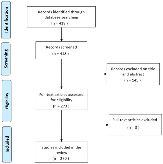 The current study included 270 research articles. The study selection process has been summarized in the PRISMA chart in Figure 1. The literature search resulted in 418 records, of which 145 were eliminated in line with the inclusion criteria. Among them, many articles contained the word “beer”, but it was referring to Beer’s law and not to beer as a beverage. The remaining 273 articles were carefully screened, and one paper was excluded in line with the exclusion criteria. Two additional studies were discarded because we did not have access to the full text.