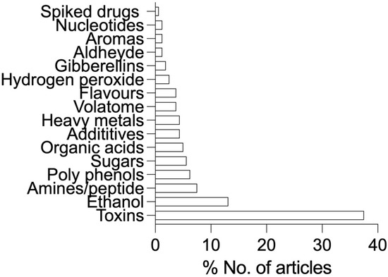 We have briefly summarized the focal molecular targets for the beer analysis in Figure 2. As observed from Figure 2, most of the sensometric work has been focused on toxins, especially ochratoxins (OTA, OTB, and OTC), followed by ethanol, amines, polyphenols, sugars, organic acids, and heavy metals. The order in the discussion is different in Figure 2 due to the type of sensors, e.g., sugars and ethanol were tested using similar/same sensors. Therefore, in order to obtain a cohesive text flow, we discussed compounds better suited with flow.