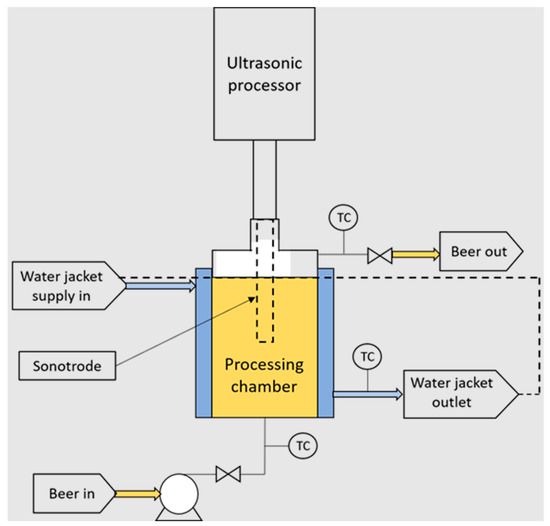 In the brewing industry in particular, US technology has generated a lot of interest given its promising effects on beer processing and preservation, such as increased product yields; reduced processing times; lower operating and maintenance expenses; improved taste, flavor and color; and the elimination of pathogens at lower temperatures [55,104]. Furthermore, ultrasonic technology accelerates the transport of waste materials away from cells as well as the oxygen and nutrients required for cell growth, which consequently allows faster microbial growth and a more effective beer fermentation [102,104]. Currently, this innovation has been mostly used in beer production at the laboratory scale to increase beer yield at the beginning of the mashing process, to hasten fermentation and to defog beer before bottling [54,55]. Despite this, there is still much to discover regarding the use of this technology to pasteurize beer. Figure 3 displays a schematic representation of a continuous power ultrasonic (sonotrode) unit and cooling system.