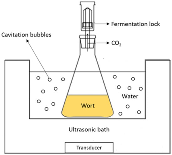Choi E. et al. (2015) examined the impact of continuous high-intensity ultrasonic bathing (400 kHz with 120, 160 and 200 W of input power for 2, 6 and 12 h) on the initial fermentation of beer brewed from six-row Korean barley. Here it was discovered that ultrasonication enabled the brewing process to be hastened and allowed the production of more ethanol content. Higher ultrasonic power and longer ultrasonic periods resulted in the production of more alcohol, except for the 200 W treatment, which had a negative effect on the viability of the yeast. Particularly, intermediate power (120 and 160 W) significantly increased the final alcohol content by 13.18%. The sample produced the most alcohol when sonicated at 160 W for 12 h. Apart from the 200 W treatment, the samples exposed to US had generally acceptable sensory qualities; however, some direct effects on the organoleptic characteristics of beer were found, as they displayed a stronger carbonation flavor, aroma, mouthfeel and aftertaste than young beer [57].