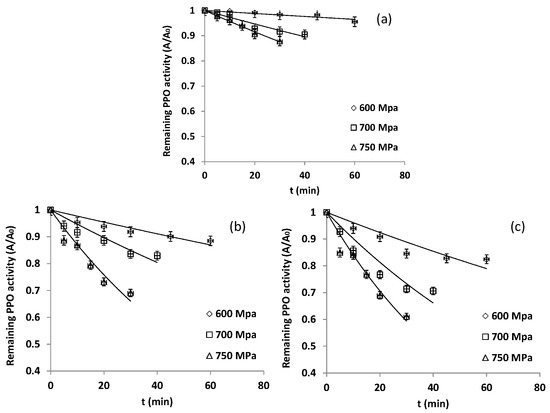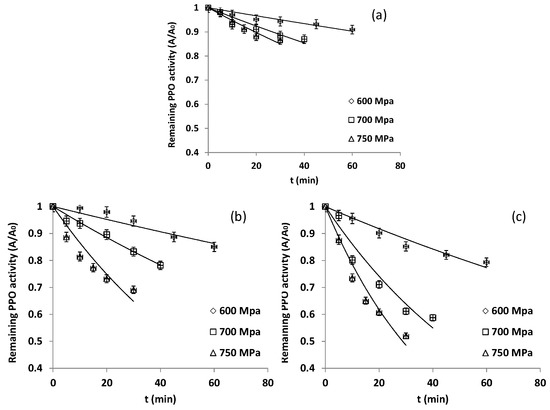 PPO inactivation followed a first order kinetic model [4]. PPO activity decrease was described by Equation (1) or Equation (2) as a function of time at constant pressure (600–750 MPa) processing conditions.