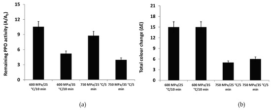Figure 3. (a) PPO inactivation (remaining PPO activity) and (b) color change (total color change—ΔΕ value) of avocado puree-based smoothie beverage (pH = 4.991 ± 0.110). Processing (pressure-temperature-time) conditions: 600 MPa-25 °C-10 min, 600 MPa-35 °C-10 min, 750 MPa-25 °C-5 min, and 750 MPa-35 °C-5 min. Error bars represent standard deviation from multiple treatments.