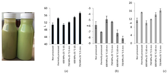 Figure 4. Color parameters (a) L, (b) a, (c) b values of non-processed, thermally processed (atmospheric-90 °C-5 min), and HP processed (processing pressure-temperature-time conditions: 600 MPa-25 °C-10 min, 600 MPa-35 °C-10 min, 750 MPa-25 °C-5 min, 750 MPa-35 °C-5 min) avocado puree-based smoothie beverage samples (Average values ±Standard deviation. In Picture: the avocado puree-based smoothie beverage prototype (immediately after the production on the right, and after storage on the left).