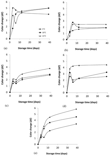 Experimental ΔE values during cold storage were mathematically modelled using a three-parameter sigmoid equation (t0, kΔΕ, ΔEmax) (Equation (7)).