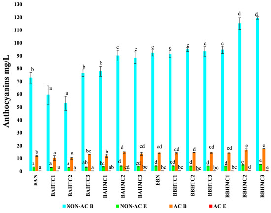 Changes in the anthocyanin content of samples determined with HPLC–DAD and grouped by anthocyanin families at the beginning and the end of the storage period. Different letters indicate a significant difference between means (p < 0.05). Non-AC = Non-acylated anthocyanins; AC = acylated; B = beginning; E = end.