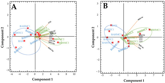 PCA was carried out for the anthocyanin content at the beginning and the end (Figure 2A,B). The distribution is explained by the first two principal components. PC1 is positively contributed to by the identified anthocyanins. Two different clusters can be identified. The first represents samples prepared with the low-mineral water, characterized by lower content of anthocyanins, and the second group consists of samples presenting higher content of anthocyanins, mainly in samples BBHMC2 and BBHMC3. These results showed that samples can be classified according to their mineral composition and their acidity. Beverages prepared with high-mineral water and with high pH values presented a higher content of anthocyanins. However, in the first group, BAHMC2 and BAHMC3 had a high content of anthocyanins that was closer to the samples of the second group. Thus, this can be an indication that mint extracts influence anthocyanin content.
