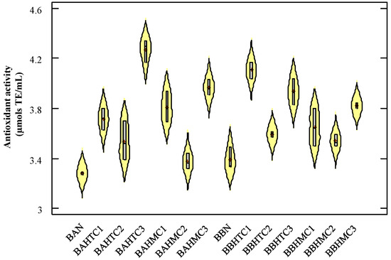 Violin chart for the antioxidant activity measured in the prepared beverages.
