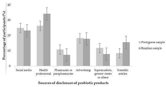 The participants were asked about which sources of information enabled them to obtain knowledge about probiotic products. Among the different sources of information mentioned, health professionals (26.2% of the Portuguese sample and 34.1% of the Brazilian sample), social media (24.8% Portuguese and 23.1% Brazilian), and advertisements by marketing campaigns (18.2% Portuguese and 17.6% Brazilian) stood out as the main sources through which participants obtained information about these products (Figure 1).