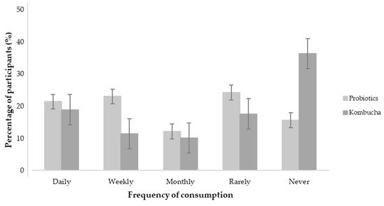 Subsequently, the differences found between the consumption pattern of probiotics and Kombucha in the Portuguese and Brazilian samples were not statistically significant. In other words, the consumption pattern between the two samples is similar. However, these results may be conditioned by a lack of information. In the study conducted by Bressa and colleagues about the perception and attitudes of young students toward functional foods (e.g., probiotics), they verified that more than half of the respondents were unfamiliar with the concept; however, they would buy this type of product in the future if more information on the benefits was made available [37]. Additionally, a study was carried out on 104 students, with the objective of assessing knowledge and awareness of probiotics among students. The authors concluded that 94.1% of consumers were familiar with the concept, and more than half of the respondents (52%) had taken probiotics for gastrointestinal purposes, thus highlighting the need for increasing awareness about other benefits for health [39].