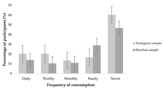 Similarly, according to the results obtained (χ2(5) = 12.6, p = 0.027), it is possible to affirm that there is a significant positive association between the consumption patterns of Kombucha in the Portuguese and Brazilian samples. Figure 4 displays the frequency of consumption of Kombucha for each sample. Almost half (46.6%) of the participants in Brazil had never consumed Kombucha, while more than half of the participants in Portugal (60.1%) reported that they had never consumed Kombucha.