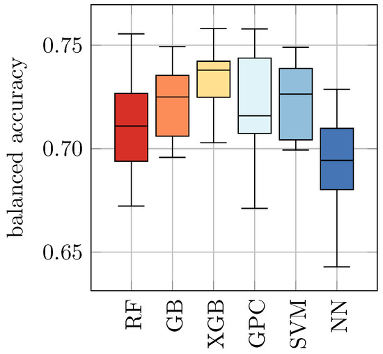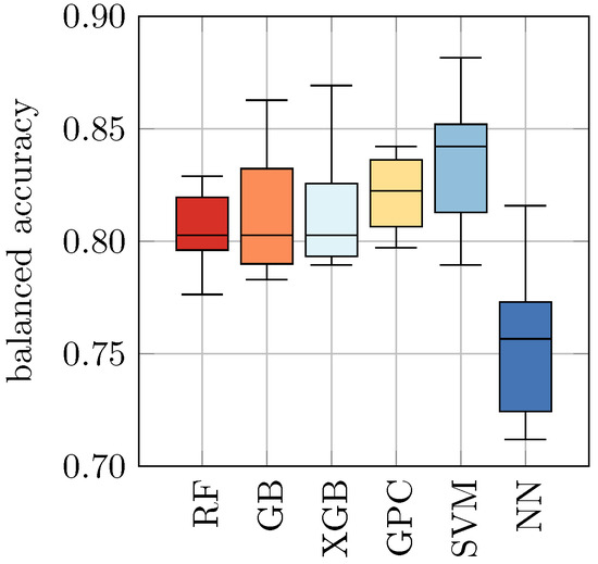 As listed in Table 4, we found in our study that the balanced accuracy ranges from 0.76 ± 0.03 for NN to 0.84 ± 0.03 for SVM. The remaining models achieved a balanced accuracy of 0.82 ± 0.03 and 0.81 ± 0.02, respectively.
