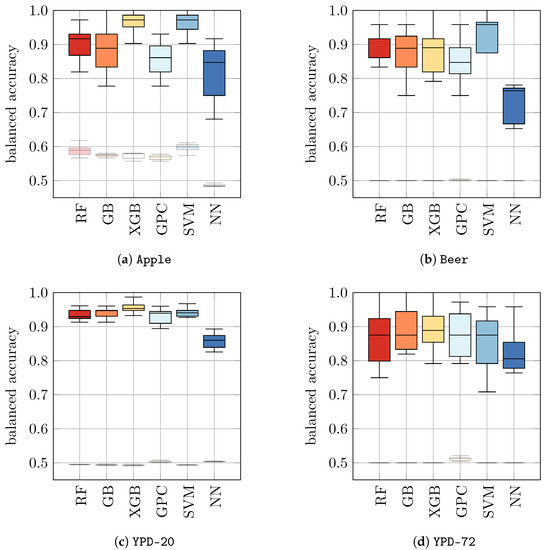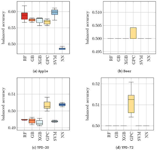 As a consequence of these findings, we trained new models on each dataset separately, following the approach detailed in Section 4.1. That is, we considered the same four datasets as before (Apple, Beer, YPD-20, and YPD-72) and trained ten classifiers on each dataset for each ML approach using 10-fold cross-validation. With this approach, we checked if the predictive performance could be increased with different data. The results are presented in Table 5 (b) and Figure 3. Indeed, we found that for all datasets tested in this approach, the performances of ML models significantly improved compared to models that were only trained on H2O. The resulting balanced accuracy ranged from 0.73 ± 0.05 for NN on Beer to 0.97 ± 0.03 for GPC and SVM on Apple. To enable a better comparison, we show the balanced accuracies of classifiers trained on datasets with yeast in media as solid boxplots in Figure 3, whereas the classifiers from Figure 2 (that were trained on H2O) are displayed opaquely.