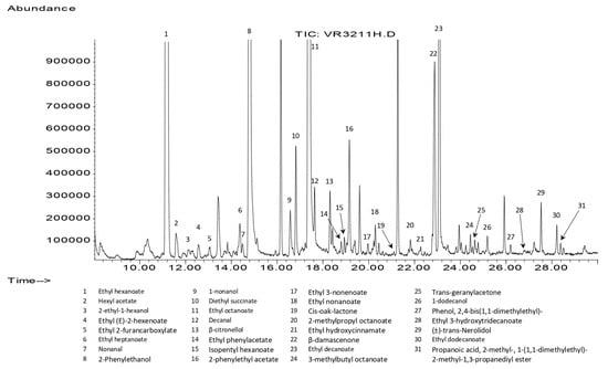 Figure 1 shows the chromatogram of the RWCH wine with the 31 volatile compounds that were identified. Ethyl hexanoate, 2-phenylethanol, ethyl octanoate, and ethyl decanoate were the compounds whose peaks showed a greater abundance. On the contrary, ethyl hydroxycinnamate, 2-ethyl-1-hexanol, ethyl 3-hydroxytridecanoate, and (cis)-oak-lactone showed a lower signal intensity.