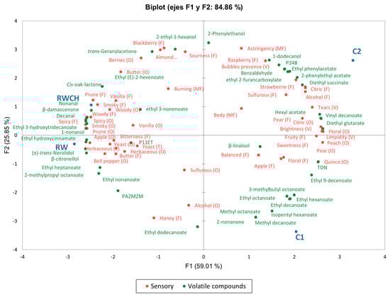 The great differences existing between the wines that did not have contact with the chips (RW, C1, and C2), and mainly the RW with the two commercial wines, can be attributed to different factors that influence both the sensory and volatile profile of wines, such as the yeast strain and the temperature used in fermentation, the degree of grapes ripeness, the soil and climate in which they were grown, or the winemaking technique [].