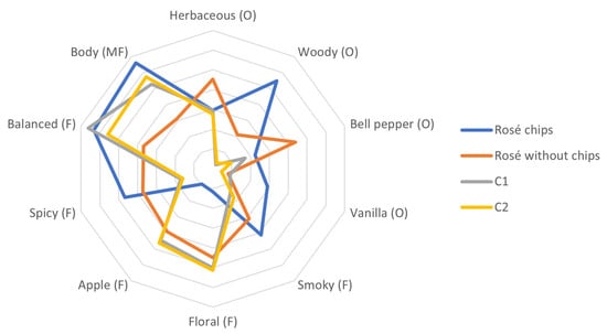 Figure 3 shows the attributes that mainly differentiated the sensory profile of RWCH wine from RW wine. As can be seen, the RWCH wine had a greater intensity in the olfactory descriptor “woody”, in the flavor descriptors “vanilla”, “smoky”, “spicy”, and “balanced”, and in the mouthfeel attribute “body”. It showed a greater presence of the characteristic attributes of wines that have undergone barrel maturation. On the other hand, the RW had a greater intensity in the olfactory descriptors “herbaceous” and “bell pepper” as well as in the flavor descriptors “floral” and “apple”, all of them being varietal notes characteristic of young wines. In the case of the commercial wines, they were very similar to each other in terms of these attributes and both were rated with a higher intensity in the flavor descriptors “apple” and “floral”, in comparison with the experimental wines, mainly with the RWCH wine.
