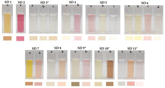Images of all soft drink samples with CIE RGB generated values. Soft drink (SD), numbers 1–11 indicate product brand and the corresponding letter (a–d) shows different flavours of the same brand. An *—carbonated.