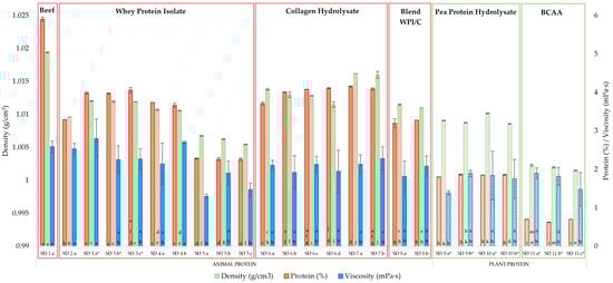 Protein content (determined using the Kjeldahl method and using a nitrogen conversion factor of 6.25), apparent viscosity and density of commercial high-protein soft drinks, distinguished into animal- and plant-based sources of protein, no pattern bars show animal protein, and bars with pattern show plant-based protein. Soft drink (SD), numbers 1–11 indicate product brand and the corresponding letter (a–d) shows different flavours of the same brand. An *—carbonated. Values with the same superscript letters are not significantly different (p > 0.05).