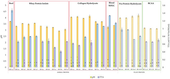 pH and TTA, distinguished into animal- and plant-based sources of protein, no pattern bars show animal protein, and bars with pattern show plant-based protein. Soft drink (SD), numbers 1–11 indicate product brand and the corresponding letter (a–d) shows different flavours of the same brand. An *—carbonated. Values with the same superscript letters are not significantly different (p > 0.05).