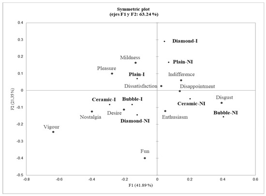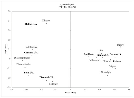 Figure 1 shows the byplot of the emotional responses by beer type and glass. Cochran’s Q test showed significant differences among samples in all the emotions during the blinded condition testing (alcoholic vs. non-alcoholic beer). These findings suggested that there was a strong association between the alcoholic beer (A), which was liked more than the non-alcoholic sample (NA), with positive emotions such as FUN, ENTHUSIASM, DESIRE, PLEASURE, NOSTALGIA, and VIGOUR. On the contrary, a correlation between non-alcoholic beer (NA) was observed with negative emotions such as DISGUST, INDIFFERENCE, DECEPTION, DISSATISFACTION, and MILDNESS.