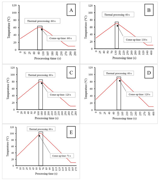 Temperature profile (red line) of the grumixama juice for each thermal treatment applied. (A) 60 °C; (B) 70 °C; (C) 80 °C; (D) 90 °C; and (E) 100 °C.