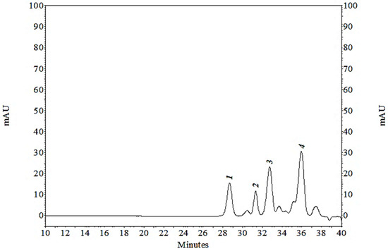 Anthocyanins identified by HPLC-DAD in the unpasteurized grumixama juice: Peak 1—delphinidin 3-glucoside; Peak 3—cyanidin 3-glucoside; and Peaks 2 and 4—unidentified anthocyanins.