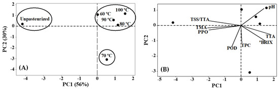 Principal component analysis (PCA) for the pasteurization process of grumixama juice (Figure 3) showed 86% cumulative variability, characterized by two principal components (PC1 and PC2). According to Rencher [37], at least 70% of the total variance should be explained by the first and second major components. PC1 explains 56% of the variation, whereas PC2 accommodates 30% of the variability in the dataset. The score graph (Figure 3A) shows that the unpasteurized juice (control) and juice pasteurized at 70 °C are outside the quadrant of juice pasteurized at 60 °C, 80 °C, 90 °C and 100 °C. In contrast, the loading chart (Figure 3B) shows the variables that contributed to the division of groups. The unpasteurized juice showed the highest values of TMA content, PPO activity, and TSS/TTA ratio, and it shows that the thermal treatment modified the characteristics of the grumixama juice, even with a greater or lesser impact on the studied properties. For the group formed by the higher temperatures (mainly 80 °C to 100 °C), pH was the property that generated similarity. Finally, the group formed at 70 °C is linked to the highest values of TPC, POD, TSS, and TTA.