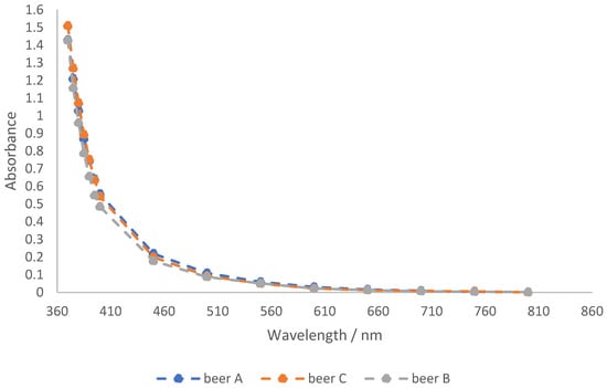 Figure 1. UV-VIS absorbance spectra of the three pilsner beers A, B, and C from southwest Germany.