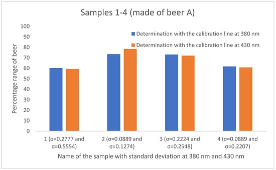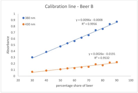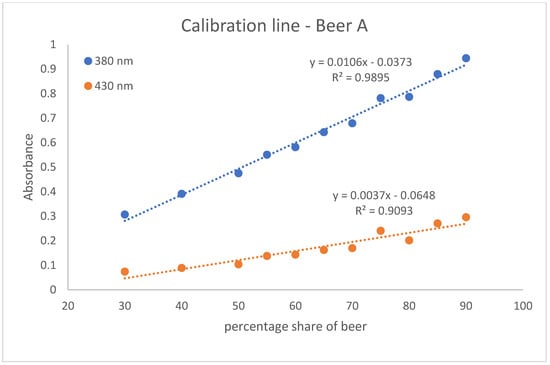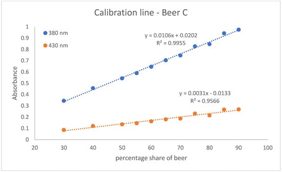 With the help of the calibration lines, the determination of twelve Radler beer samples taken from the gastronomic sector was carried out. For this purpose, two calibration lines were created per beer. They were obtained with eleven different points in the percentage range of beer from 30 to 90. One is based on the absorption values measured at 380 nm and the other on those at 430 nm. These calibration lines of beer A, beer B, and beer C are shown in Figure 2, Figure 3 and Figure 4. The calibration lines at 380 nm are steeper than those at 430 nm. This is also evident from the slope of the straight line equation of the various calibration lines. The calibration lines whose absorption values were measured at 380 nm have a larger slope than the calibration lines at 430 nm. The slope characterizes the sensitivity. The steeper the slope of the calibration line, the more sensitive the analysis method [18]. Accordingly, the method of measuring the calibration line at an absorption of 380 nm is more sensitive than the method based on the absorptions at 430 nm.