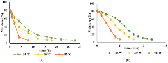 Drying curve of Opuntia ficus-indica peels from cv ‘Rossa’ (a) at different temperatures, 35 °C (green), 60 °C (yellow) and 85 °C (orange) and (b) at different microwave potencies, 120 W (green), 375 W (yellow) and 700 W (orange).