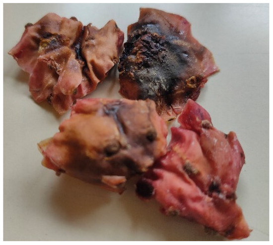 Regarding the use of MW, there are no data from the literature focusing on the effects of MW potencies on O. ficus-indica peel. This drying technology significantly reduced the drying time compared to the food dehydration methods, which is in agreement with previous findings for other fruits and vegetables [42,46,47]. In this study, drying times of around 12, 8, and 5 min were achieved for all the cultivars tested when using MW potencies of 125 W, 375 W, and 700 W, respectively. However, despite the ability of MW heating to efficiently generate heat within moist food portions, its non-uniform electromagnetic field within the MW cavity can result in excessive temperatures at product edges and corners, leading to irreversible drying and scorching and may cause the development of off-flavors [48]. This was observed in MW-dried peel, as evidenced by the dark, burned spots shown in Figure 2.