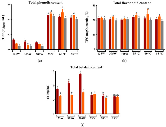 Variation in the (a) Total phenolic compounds, (b) Total flavonoids, and (c) Total betalains compounds of prickly pear peels infusions cv ‘Rossa’ (red peel) in red (▬), cv ‘Gialla’ (orange peel) in orange (▬), and cv ‘Bianca’ (white peel) in grey (▬) obtained after MW and DEHY-drying at different potencies/temperatures, respectively. Results are expressed as the average ± SD (n = 3). Different lowercase letters above each bar indicate statistically significant differences (p < 0.05).