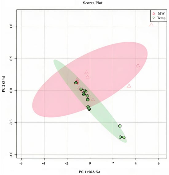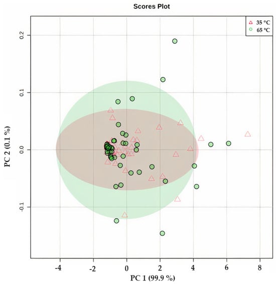 Principal component analysis (PCA) is a statistical technique used to reduce the dimensionality of large datasets while maintaining as much variance as possible. In this study, PCA was employed to analyze the infusions of O. ficus-indica obtained from different drying techniques and cultivars. Specifically, three different drying temperatures (35, 60, and 85 °C) and three microwave potencies (125, 375, and 700 W) were investigated, and the resulting clusters identified in the PCA (Figure 6) demonstrated a correlation superior to 95%, that both the drying techniques and cultivar composition had an impact on the observed variation in the results. Figure S1 (supplementary materials) also depicts the effects of different cultivars on the PCA. Further, the Biplot PCA, illustrated in Figure S2, highlights that the concentration of betalains in the infusions was the main difference between the techniques, and this was represented by the points farthest from the central cluster. These findings are consistent with the results obtained from the cluster analysis (Figure 5). Additionally, the scavenging of superoxide and nitric oxide radicals also contributed to some variation in the drying methods, as discussed in Section 3.2.3.