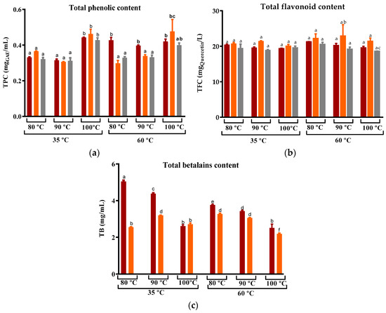 Variation in the (a) Total phenolic compounds, (b) Total flavonoids, and (c) Total betalains compounds of prickly pear peel infusions cv ´Rossa´ (red peel) in red (▬), cv ‘Gialla’ (orange peel) in orange (▬), and cv ‘Bianca’ (white peel) in grey (▬) obtained from peel dried at 35 and 60 °C and steeped at 80, 90, and 100 °C. Results are expressed as the average ± SD (n = 3). Different lowercase letters above each bar indicate statistically significant differences (p < 0.05).